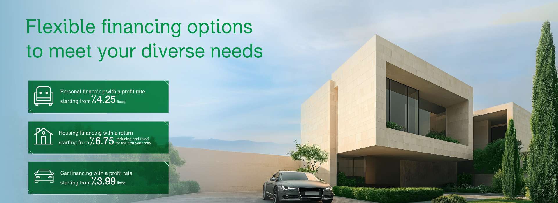 Our financing are designed to meet your needs! Own a home for you and your family, move freely in your car, invest freely in equities, buy goods, or pay your commitments with other banks with personal financing; all with the best Murabaha and Ijarah returns.