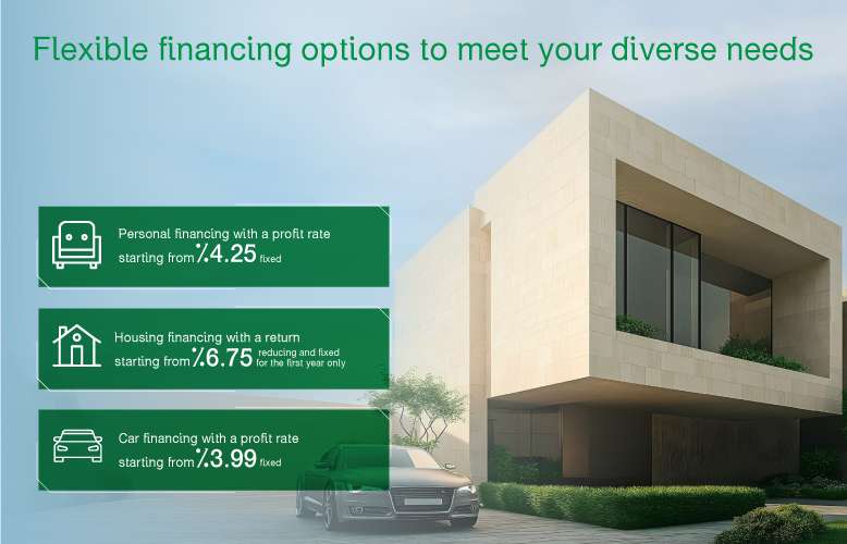Our financing are designed to meet your needs! Own a home for you and your family, move freely in your car, invest freely in equities, buy goods, or pay your commitments with other banks with personal financing; all with the best Murabaha and Ijarah returns.